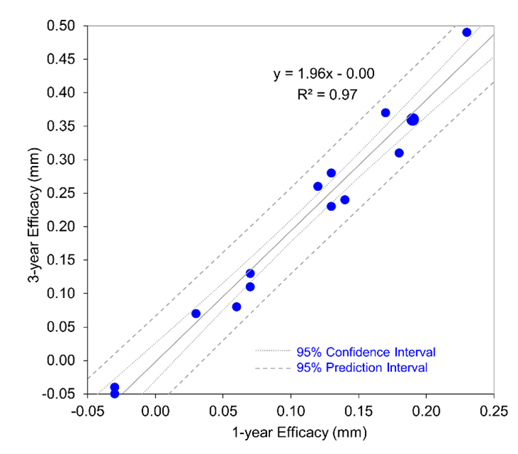 This study explores the potential of one-year efficacy data of myopia control treatments to predict three-year outcomes, an approach driven by the challenges of conducting 3-year trials (ethics, discontinuations, compliance etc). Studies of myopia progression were systematically reviewed, with a focus on axial elongation data over one and three years. The analysis included 15 datasets from 26 cohorts across 12 studies involving interventions such as spectacles, contact lenses, orthokeratology, and low-dose atropine. Using regression analysis, axial elongation over three years was predicted based on measurements from the first year alone. Despite varying study quality, such as non-randomized trials and shared control groups, the correlation between one-year and three-year efficacy was remarkably high (r = 0.98, p ⋘ 0.01), indicating that initial short-term results could reliably forecast longer-term effects where three-year efficacy was around double the one-year efficacy result (see Figure 1).