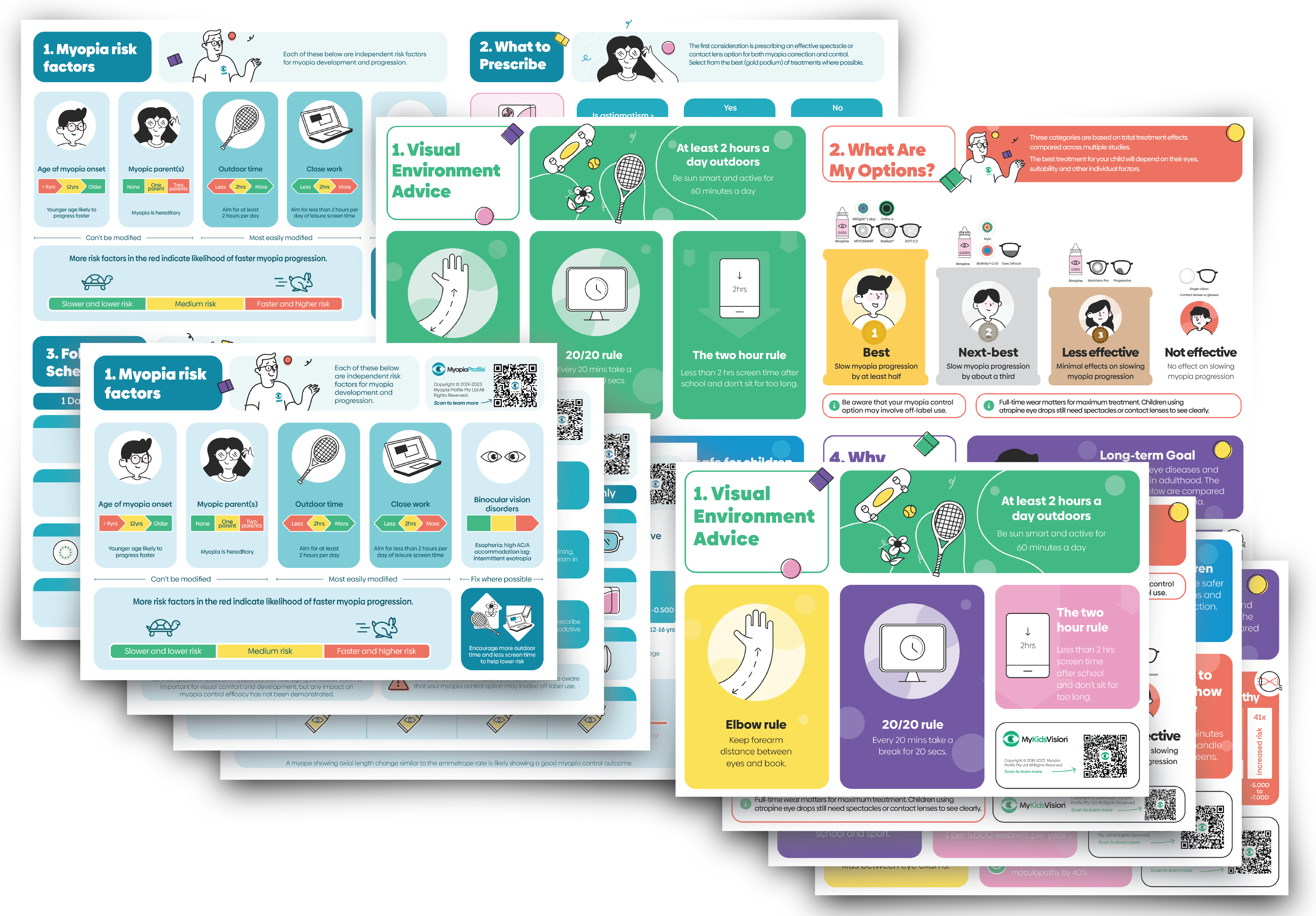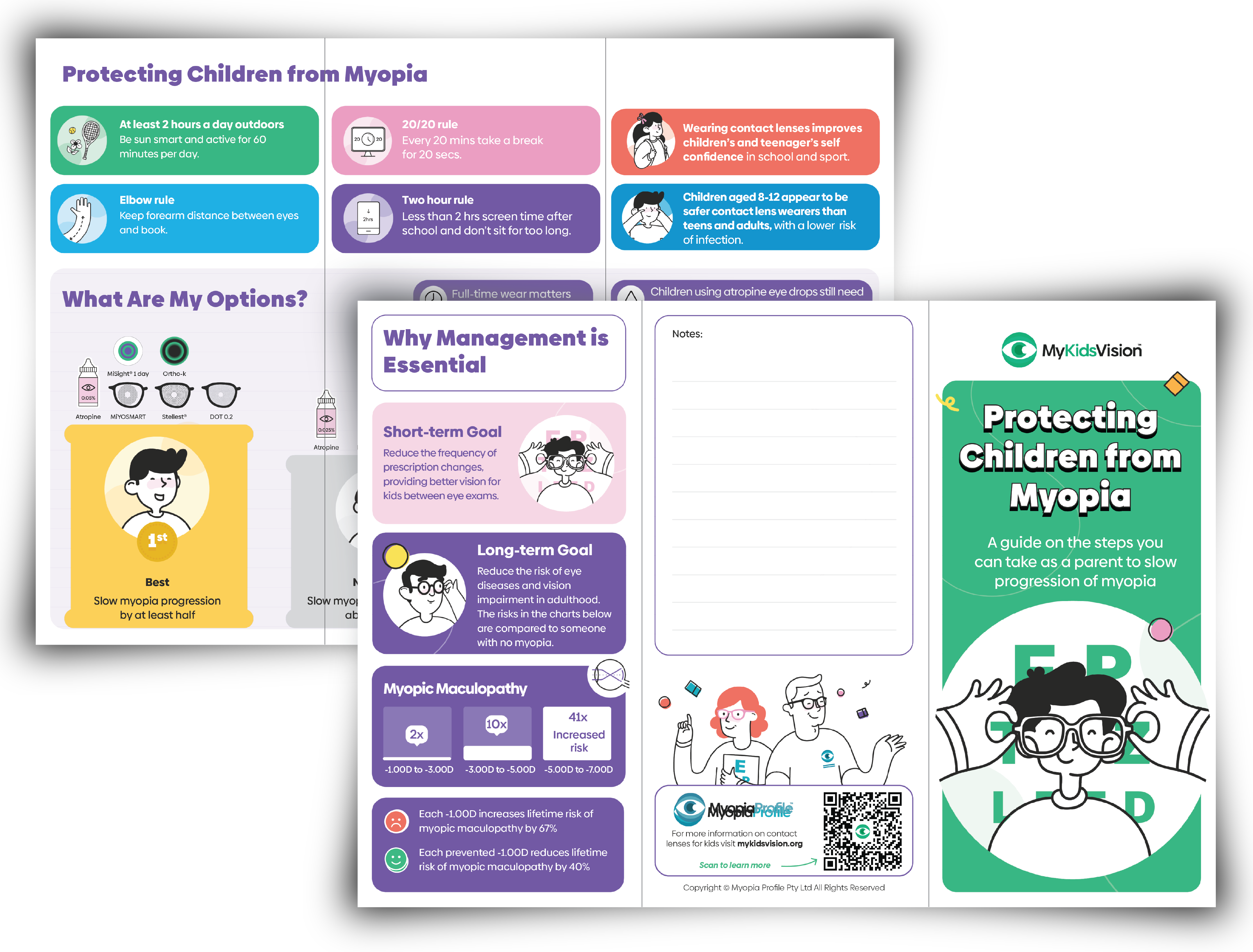 This brochure offers advice on healthy outdoor and close work time, contact lens wear risks and benefits, myopia control options, and the importance of myopia management. It provides the take-home summary for parents and carers after utilizing the Infographics in-room, and features a QR code linking to MyKidsVision.org for additional information.